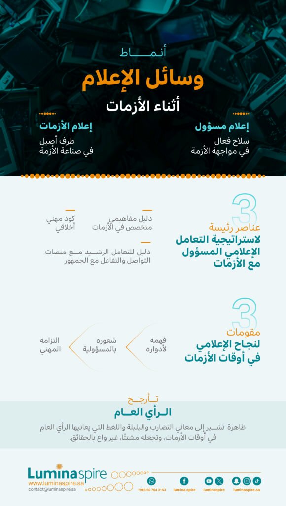 العلاقة بين الإعلام والأزمات تتخذ مسارين، الأول: إعلام الأزمات، أي أن الإعلام طرف أصيل في الأزمة وصانع لها. الثاني: الإعلام المسؤول، بمعنى أن الإعلام أداة رئيسة في حل الأزمة، والفارق بينهما في طبيعة الأدوار التي يؤديها الإعلام في المجتمع. فيصبح الإعلام طرفًا في الأزمة حينما يتبنى التحيز منهجًا في معالجاته للقضايا المختلفة، ويعتمد على التهويل والمبالغة في نقل الوقائع والأحداث، ويتورط في نشر الأخبار الكاذبة والمضللة التي من شأنها إثارة الفوضى والبلبلة، ويبث خطابات العنف والكراهية، حينها يفقد الإعلام مسؤولياته تجاه المجتمع، ويصبح مهددًا لاستقرار المجتمع وتماسكه، خاصة في ظل انتشار ظاهرة تعرف بـ”تأرجح الرأي العام” التي تشير إلى معاني التضارب والبلبلة واللغط التي يعانيها الرأي العام في فترات الأزمات، و تجعله مشتتًا، غير واع بالحقائق