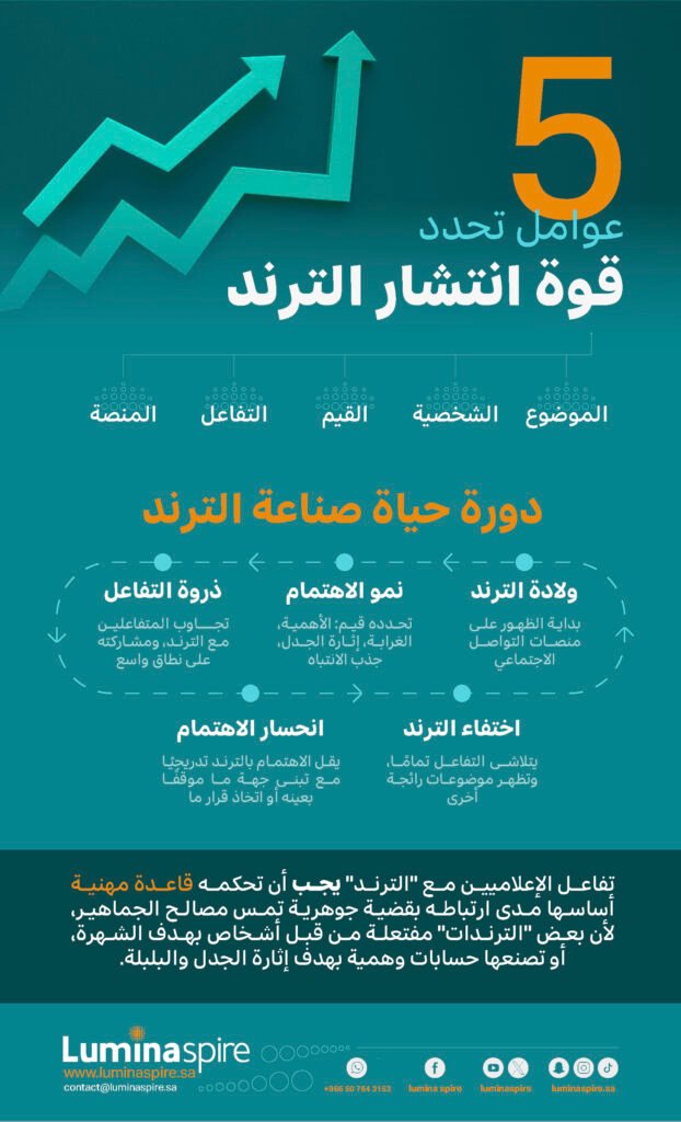 ويحكم انتشار “الترند” في الفضاء الافتراضي خمسة عوامل رئيسة، هي: طبيعة موضوعه، الشخصية المرتبط بها، القيم المحددة له، مستوى تفاعل المتابعين معه وأعدادهم، وطبيعة المنصة المتداول عبرها